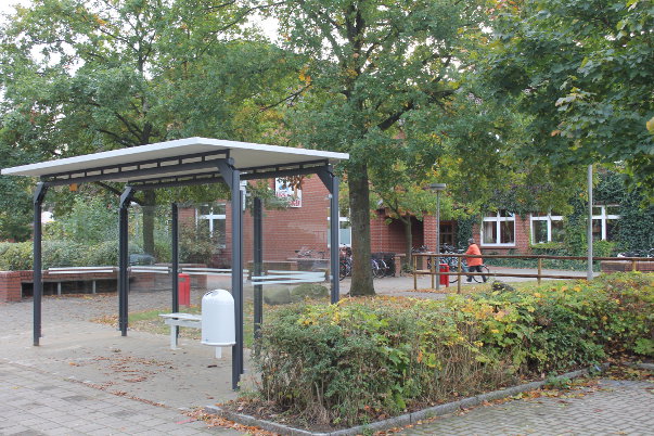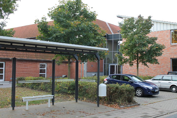 Vor dem Haupteingang ist Anfang Oktober ein Unterstand für die Bushaltestelle errichtet worden. Zum Zeitungsbericht
