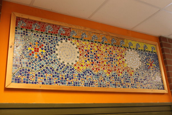 Zum anderen hängen unmittelbar am Eingang zwei Mosaike, die ebenfalls während der letzten Projektwoche entstanden sind. Frau Wessels und Frau Niehoff