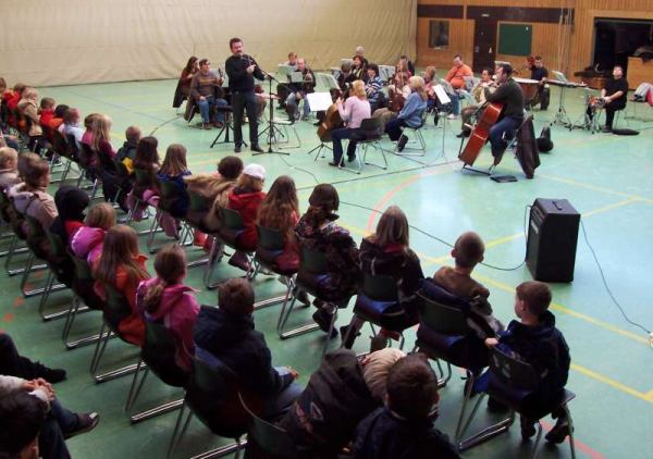 Am 12. November 2007 gastierte an unserer Schule das philharmonische Orchester aus Haskovo (Bulgarien). Das öffentliche Konzert fand in der Sporthalle statt, damit möglichst viele Kinder teilnehmen konnten und dabei auch einen guten Blick auf das Orchester hatten. In zwei Durchgängen zu je 45 Minuten kamen alle Schüler der HRS Hodenhagen sowie die 3. und 4. Klassen der Grundschule Ahlden in den Genuss zeitgenössischer ernster (also: klassischer) Musik.