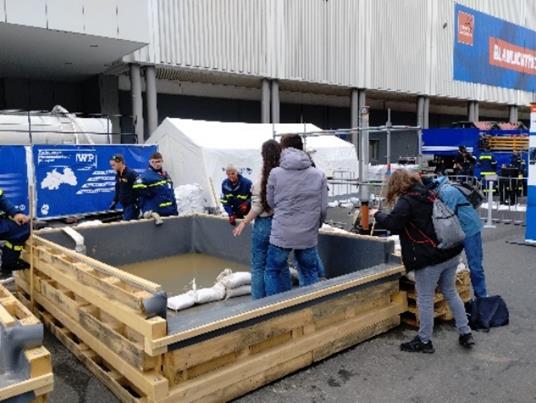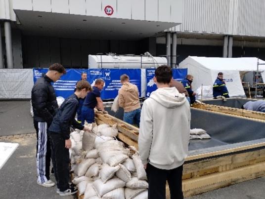 An eigene Erfahrungen während des Winter-Hochwassers in unserer Region wurden die Klassen beim Außenstand des THW erinnert. Und es wurde dabei sogar sehr realitätsnah und zupackend. In einem Duell durften zwei Gruppen gegeneinander Sandsäcke stapeln, um ein kommendes Hochwasser abzuwehren. Beide Gruppen machten sich mit Elan an den Bau, kamen aber am Ende nicht ganz ohne nasse Schuhe heraus. Abschließend wurde den Klassen erläutert, welche Fehler sie gemacht haben und wie eine Schichtung der Sandsäcke richtig zu erfolgen hat, um Hochwasser erfolgreich abwehren zu können.
