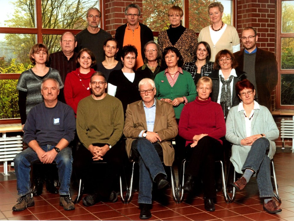 Vordere Reihe von links nach rechts, sitzend: Hr. Regenhardt, Hr. Welk, Hr. Daube (Schulleiter), Fr. Fox (Sekretärin) und Fr. Seide-Matthies