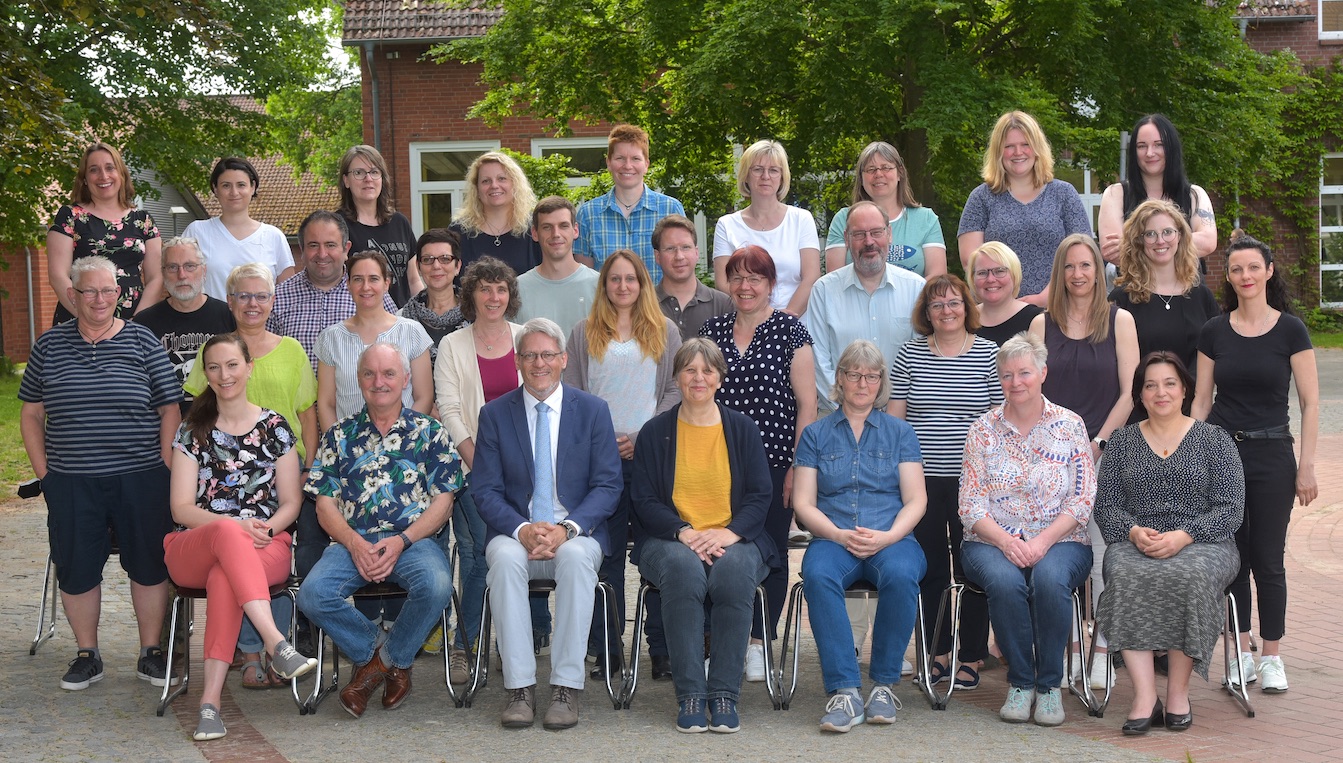 Vorderste Reihe von links nach rechts, sitzend: Frau Glatchak, Hr. Regenhardt, Hr. Welk (Schulleiter), Fr. Politt-Lessau (stellv. Schulleiterin), Fr. Strelen (Sekretärin), Fr. Becker, Fr. Pflanz