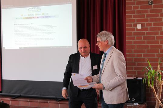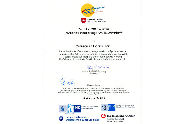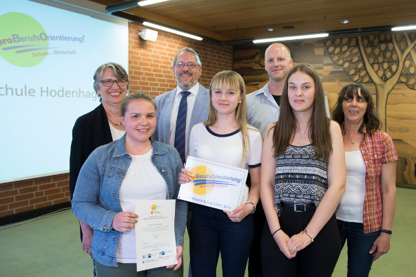 Die OBS Hodenhagen hat aufgrund ihres besonderen Engagements im Bereich der Berufsorientierung mehrfach das Zertifikat proBerufsorientierung erhalten und zählt damit zu den Schulen, die ihre vorbildliche Vorbereitung auf das Berufsleben ausgezeichnet worden sind. Das Zertifikat wird an Schulen in Niedersachsen vergeben, die die Maßnahmen zur Berufsorientierung systematisch planen, ihre Ergebnisse gründlich überprüfen und danach ihr Konzept anpassen. Aktuell sind knapp 70 Schulen in ganz Niedersachsen zertifiziert. Die letzte Zertifizierung fand im Schuljahr 2023/24 statt. Am 29.5.2024 überreichte die Jury bei einem Termin vor Ort die Urkunde an das BO-Team der OBS. Die Zertifizierung gilt für vier Jahre, also für den Zeitraum 2024-2028.