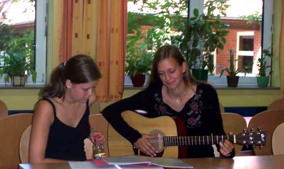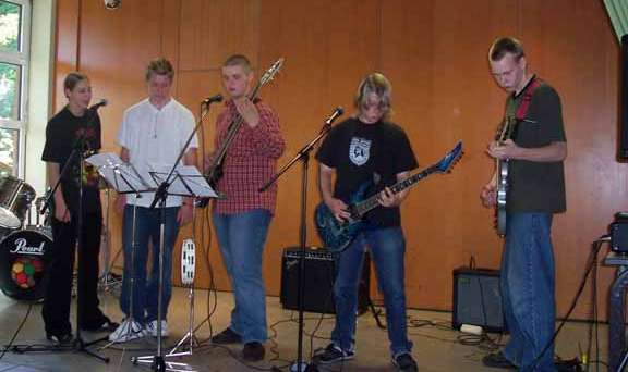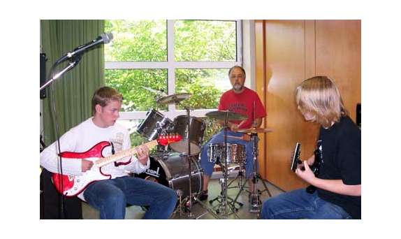 Unter der Leitung von Herrn Heymel probte die Schulband mit Schülern, die sonst nicht Mitglied der Schulband sind, Lieder ein.