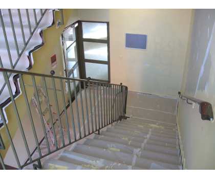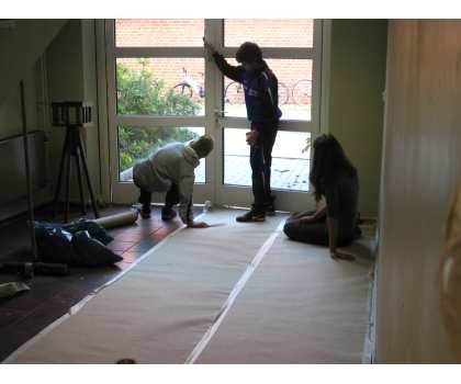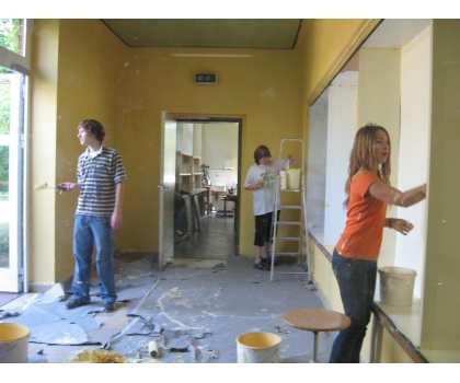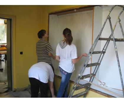 Wir wurden in drei verschiedenen Gruppen eingeteilt: die erste Gruppe beschäftigte sich mit den Säulen, die zweite Gruppe arbeitete im Treppenhaus und die letzte Gruppe verschönerte den Raum vor den Werkraum und die Schaukästen. Die zweite und dritte Gruppe säuberten erst ihre Arbeitsplätze, legten Papier aus, klebten alles mit Klebeband ab, spachtelten die Löcher mit der Spachtelmasse zu und begannen mit den Vorstrich an. Während im Treppenhaus mit zwei verschiedenen Gelbtönen gestrichen wurde, arbeiteten wir hingegen vor den Werkraum nur einem Gelbton, danach wurden die Wandkästen vorgestrichen und gelb lackiert.
