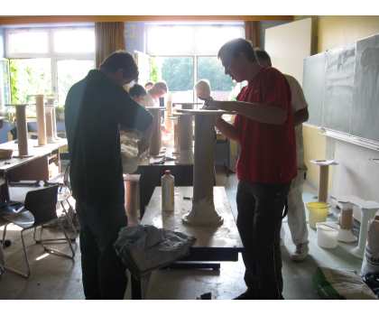 Am kompliziertesten war es, die Blumensäulen herzustellen. Die Materialen waren zugeschnittene Papprollen, auf denen Teppich aufgerollt war, runde Standteller aus Holz und Holzleisten. Die Schüler der Gruppe befestigten alle vier Teile der Säulen, die Spachtelmasse wurde aufgetragen, dann haben sie die Masse mit einem Formspachtel abgezogen und trocknen gelassen. Als die Säulen trocken waren, tragen sie die Säulen auf den Schulhof, um die Gipsreste abzuschleifen. Danach fingen die Schüler mit den weißen Voranstrich an.