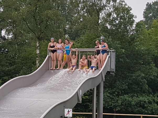 Der Schwimmunterricht ist aber mehr als nur Techniken erlernen und Bahnen schwimmen. Die Kenntnis und das Einhalten von Baderegeln sowie die Auseinandersetzung mit Hilfsmaßnahmen zur Selbstrettung gehören natürlich auch dazu. Wasserball ist ebenfalls Teil unseres Schwimmunterrichts. Nach der intensiven Übungszeit können die Schüler/innen dann verschiedene Einzel- und Partnersprünge vom Sprungbrett (1 m und 3 m) ausführen. Hier hat die Kreativität keine Grenzen!