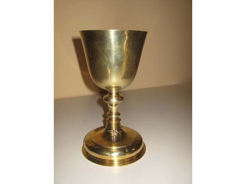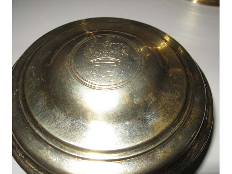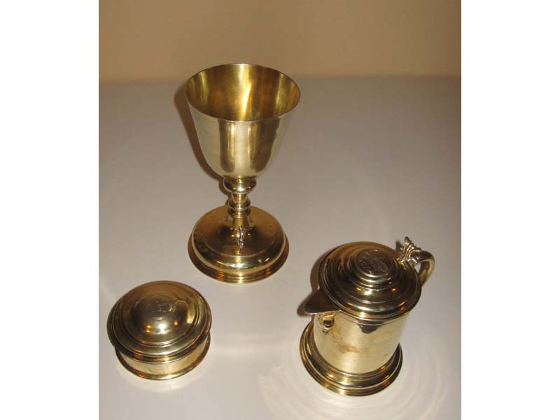 Abendmahl benutzt wird, einen Weinkrug und eine Oblatendose, darauf kann man als Gravur eine Krone, die