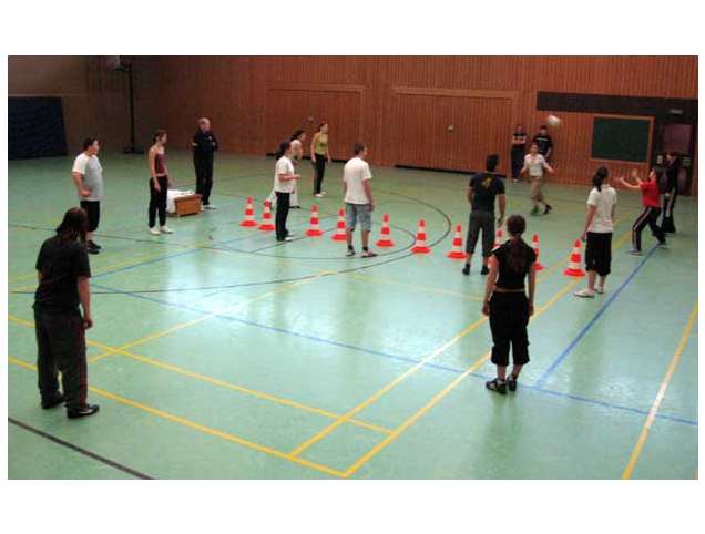 2) "Ball unter die Schnur". Die Spieler versuchen, den Ball unter einer Schnur hindurch zu werfen und die gegenüberliegende Wand zu treffen, während die gegnerische Mannschaft versucht, die Bälle abzuwehren und selbst zu treffen. Jeder Treffer zählt.